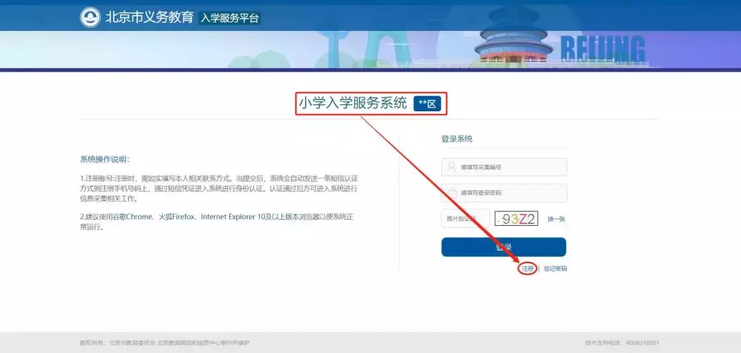 3. 进入 “小学入学服务系统”登录页后,点击“注册”。