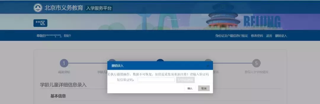 ■ 输入验证码后,点击“确认”按钮,系统提示“撤销成功”说明该条信息已被撤销。撤销录入完成后该用户数据将在 “非本市户籍适龄儿童接受义务教育证明证件材料审核入口”系统内删除,如果用户想重新注册提交非本市户籍适龄儿童接受义务教育证明证件材料审核,须重新采集基本信息。