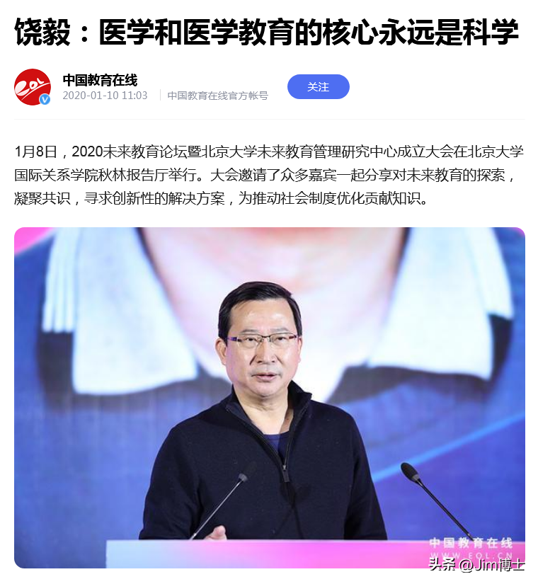 在2020年北京大学未来教育管理研究中心成立大会时,还举办了一个假模假样的未来教育论坛,彼时已经担任首都医科大学校长的饶毅教授还参加了这个论坛,并且发表了《医学和医学教育的核心永远是科学》。