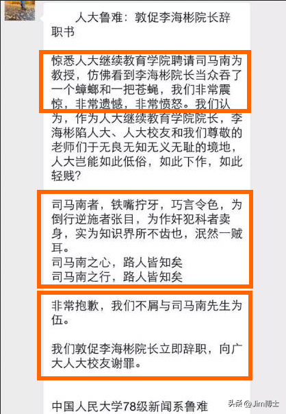 随后,人民大学聘用司马南的事情就遭到了人民大学校友的强烈抵制。78级校友鲁难率先发声,并敦促聘请司马南的院长李海彬辞职,言辞非常激烈: