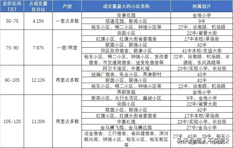 105-120万套价的区间,首次出现了金马小区的身影,同时红旗小区和省委宿舍再次出现,证明这两个17中本校和草场街“双片”的小区,两室房源套价在110万出头。