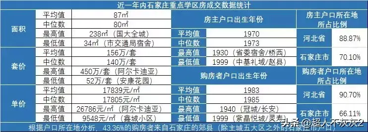 从成交数据来看,两室占59%,三室占26%;绝大房主户口来自石家庄市,并且多为70后;而购房者户口中,9%来自外省,25%来自河北省其他地市,66%来自石家庄市,43.36%来自石家庄市的郊县。也就是说,购买石家庄学区房的主要人群,为:来自石家庄郊县和河北省其他地市的80后。