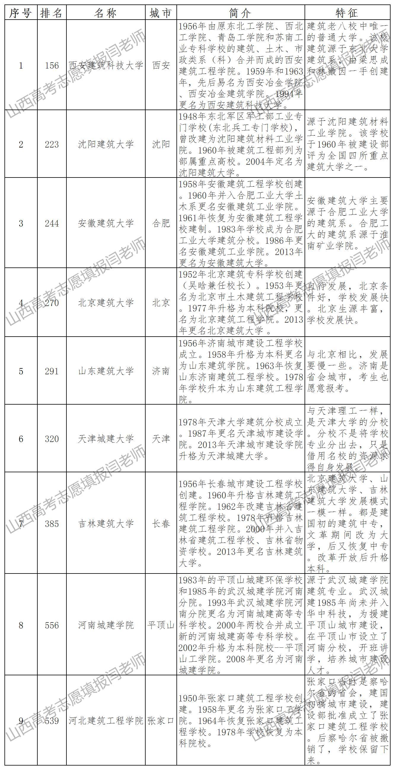 提起建筑大学,家长和考生很容易想到西安建筑科技大学、吉林建筑大学、沈阳建筑大学、北京建筑大学、山东建筑大学、安徽建筑大学、天津城建大学,甚至还会想起平顶山的河南城建学院、张家口的河北建筑工程学院这些贴着建筑标签的建筑类院校,其实这些建筑大学仅是我国建筑院校的冰山一角。上世纪六七十年代,人们习惯地把我国开设有建筑学专业的八所名牌大学堪称为中国建筑老八校。这老八校指的是:清华大学、东南大学、同济大学、天津大学、华南理工学院、重庆建筑学院(并入重庆大学)、哈尔滨建筑学院(并入哈尔滨工业大学)、西安冶金建筑学院(今西安建筑科技大学)。