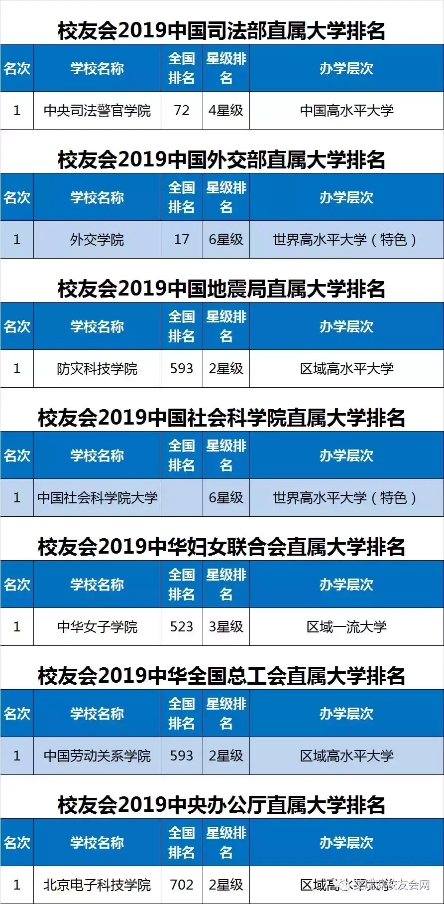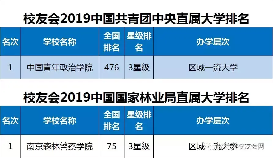 中国青年政治学院名列2019中国共青团中央直属大学排名首位;南京森林警察学院名列2019中国国家林业局直属大学排名首位;