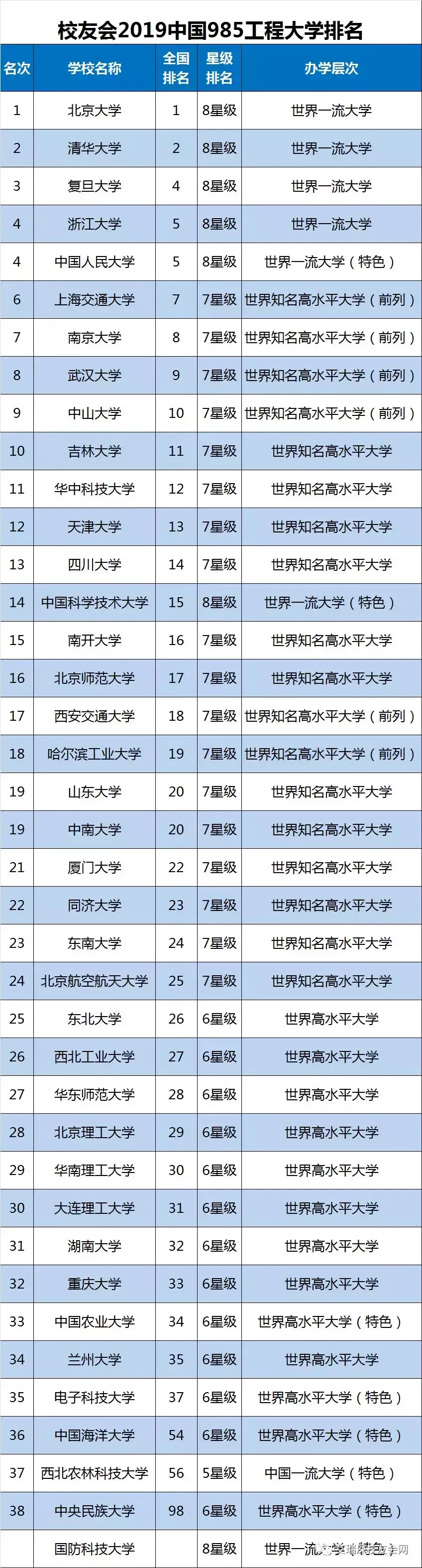 在艾瑞深中国校友会网2019中国大学排名中,北京大学、清华大学、复旦大学、浙江大学、中国人民大学、上海交通大学、南京大学、武汉大学、中山大学、吉林大学位列校友会2019中国985工程大学排行榜前10强。全国35所985工程高校跻身全国前40强。