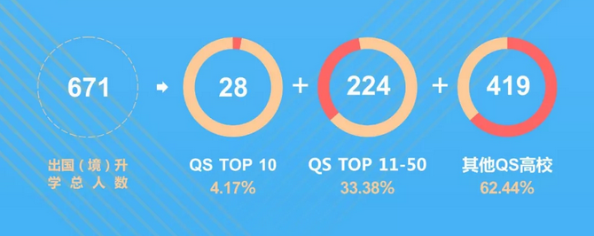 本科毕业生出国(境)升学671人,28人进入QS2018排名前十的国际顶尖大学,111人进入QS2018排名11-30大学,113人进入QS2018排行31-50的大学。