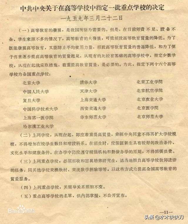 1959年3月22日中共中央发出《关于在高等学校中指定一批重点学校的决定》,指定16所高校为全国重点大学,试招研究生: