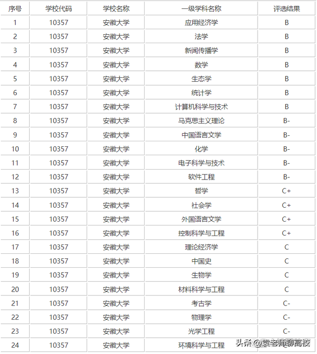 安徽大学在第四轮学科评估中,安徽大学有24个学科上榜,其中应用经济学、法学、新闻传播学、数学、生态学和统计学、计算机科学与技术等学科被评为B,具体可见下图。