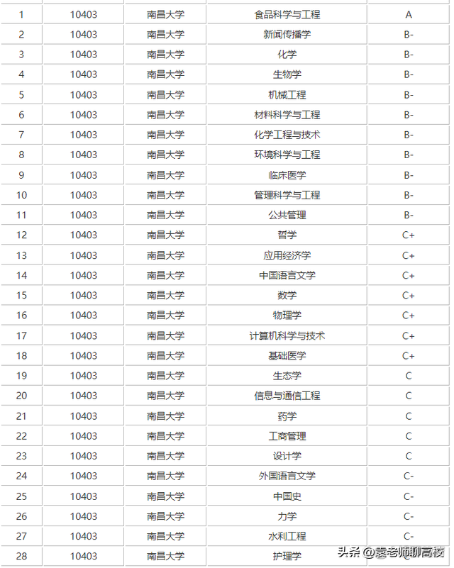 南昌大学在第四轮学科评估中,南昌大学有28个学科上榜,其中最强的学科是食品科学与工程,被评为A,新闻传播学、化学、生物等10个学科被评为B-,具体可见下图。