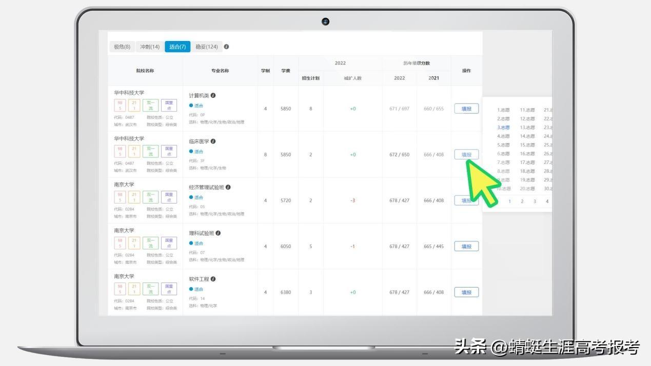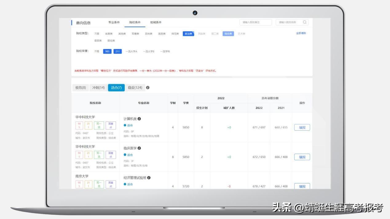 考生输入分数和选科之后即可一键生成志愿填报方案,填报范围及推荐志愿是根据考生的分数以及排名区间综合计算所得,并且有“极危”“冲刺”“合适”“稳妥”四种风险提示,考生可以在此页面手动调整填报方案。