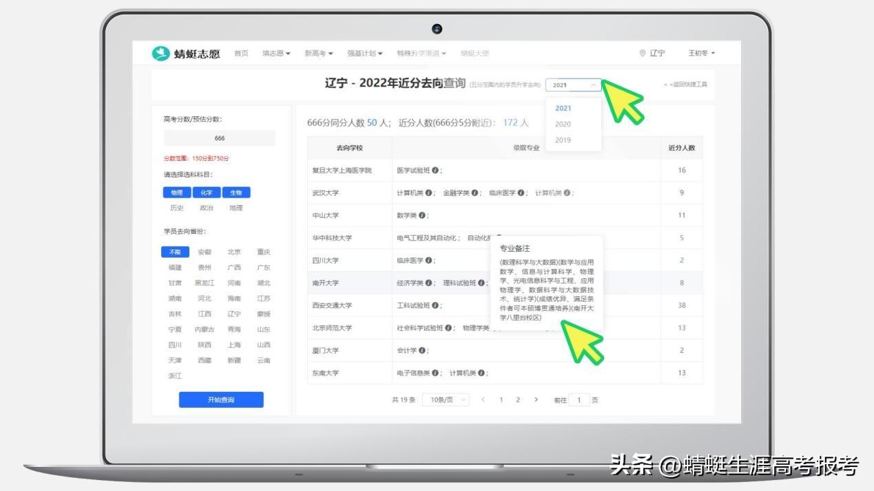 学业规划云平台的核心功能之一是查询“同分去向”,输入分数、选科和去向省份,即可一键查询历年同分考生的去了哪些学校、哪些专业和同分段人数。升级为V4.5版本后,“同分去向”优化为“近分去向”功能,数据更多,可查询近3年内5分差范围内的“竞争对手”,帮助考生更加精准地了解自己的定位。