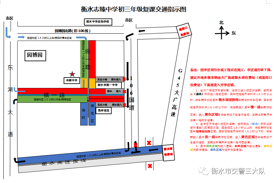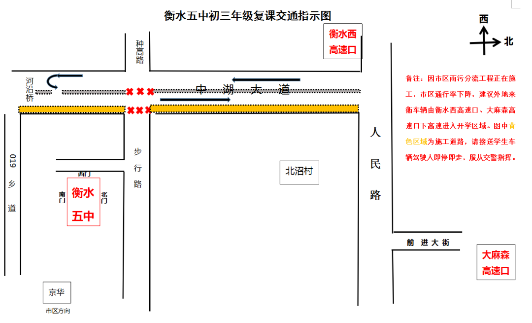 出行提示:因市区雨污分流工程正在施工,市区通行率下降,建议外地来衡车辆由大广高速衡水南收费站(或滏阳口收费站)下高速进入开学区域。