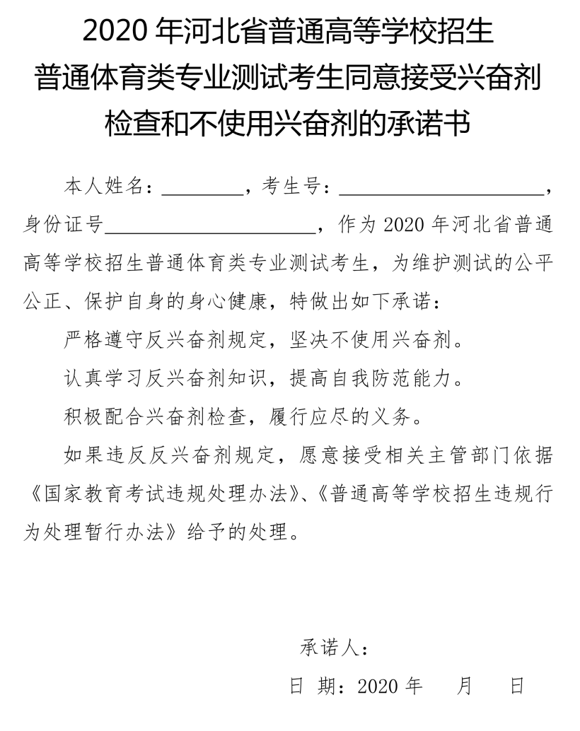 1.签订《2020年河北省普通高等学校招生普通体育类专业测试考生同意接受兴奋剂检查和不使用兴奋剂的承诺书》(见附件2)。