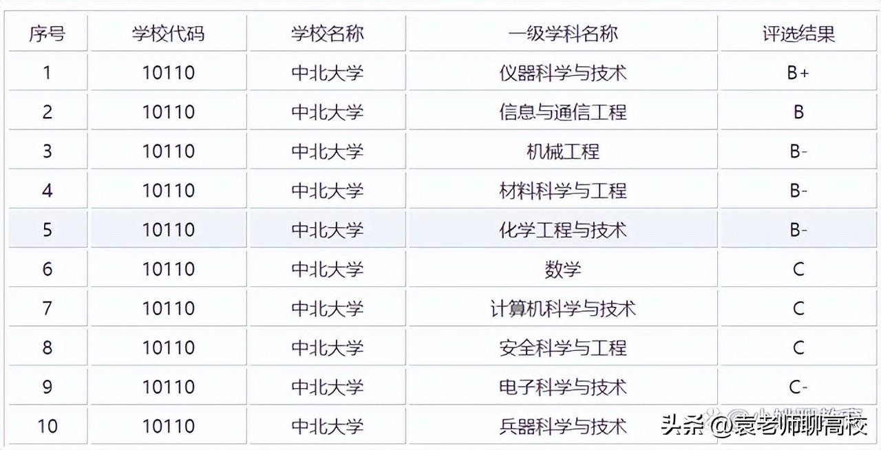 中北大学在第四轮学科评估中,有10个学科上榜,其中最好的学科是仪器科学与技术,被评为B+,信息与通信工程被评为B,具体可见下图。