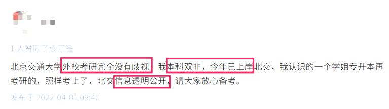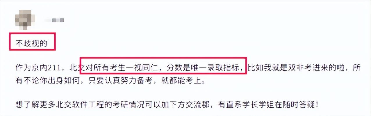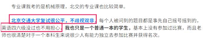 不少同学反馈北京交通大学的考研复试很公平,对所有考生都是一视同仁,并不歧视,主要看重的是初试分数及复试的综合实力表现。所以大家不用担心,争取初试高分、名列前茅,上岸概率非常大。