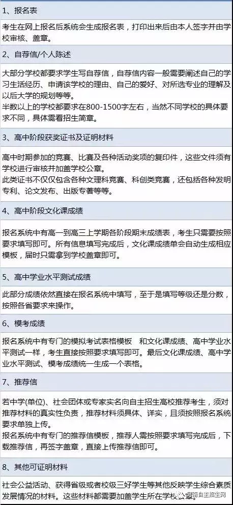 另外,最后要说的是自主招生所需报名材料虽多,但是真正影响考生是否能通过初审的材料,依然是考生的成绩、考生硬性获奖证书等,其他的材料更多是补充说明或者锦上添加花,但并不表示其他材料无需用心准备。