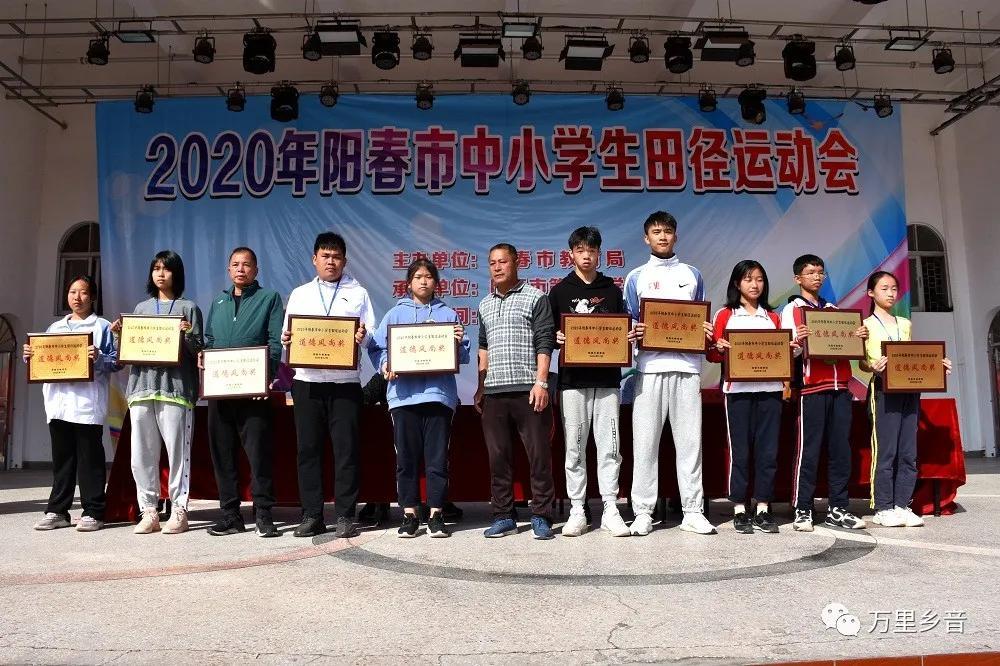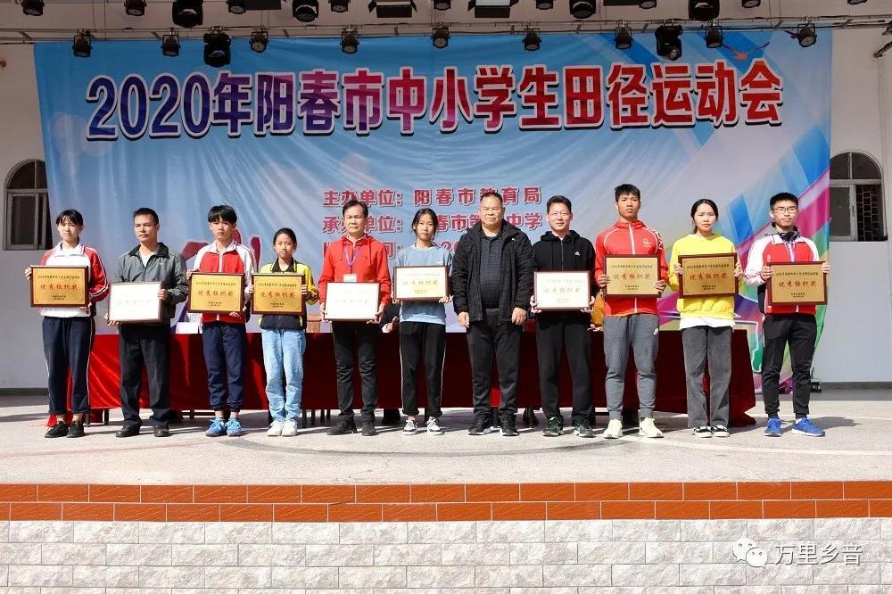 在本届田运会的闭幕式上,春湾镇中心小学、潭水镇中心小学、春城一小、逸夫小学,潭水中学、松柏中学、市三中、春湾中学以及市五中、阳春市中等职业技术学校获得了优秀组织奖受到表彰。阳春市教育局局长梁爱平为获奖单位颁发了奖牌,并在闭幕式最后宣布:2020年阳春市中小学生田径运动会胜利闭幕。