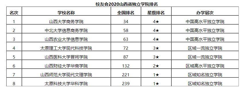 据中国校友会网(艾瑞深中国校友会网 )发布的2020中国大学排行榜中,山西省共有8所独立学院进入排名!