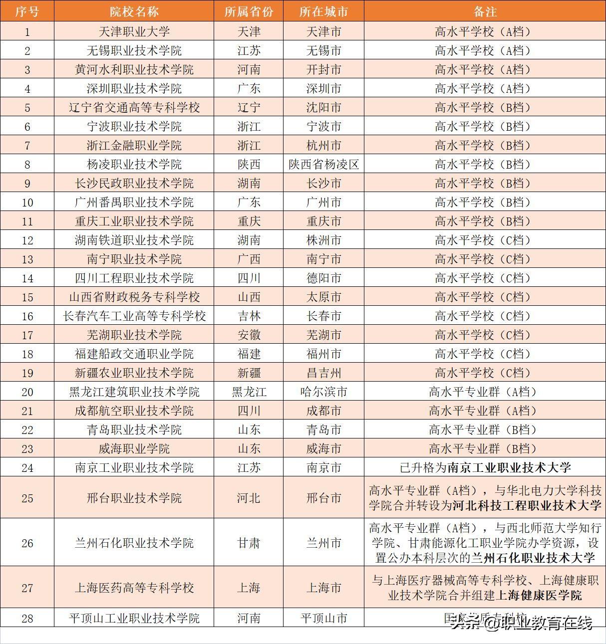 4所跻身国家双高计划一类高水平学校(A档);7所成为二类高水平学校(B档);8所成为高水平学校(C档),2所成为高水平专业群(A档),2所成为高水平专业群(B档)同属于双高计划三类。另有4所升格为本科院校,首批28所国家示范性高职不愧是有传承,有发展特色的职业院校。