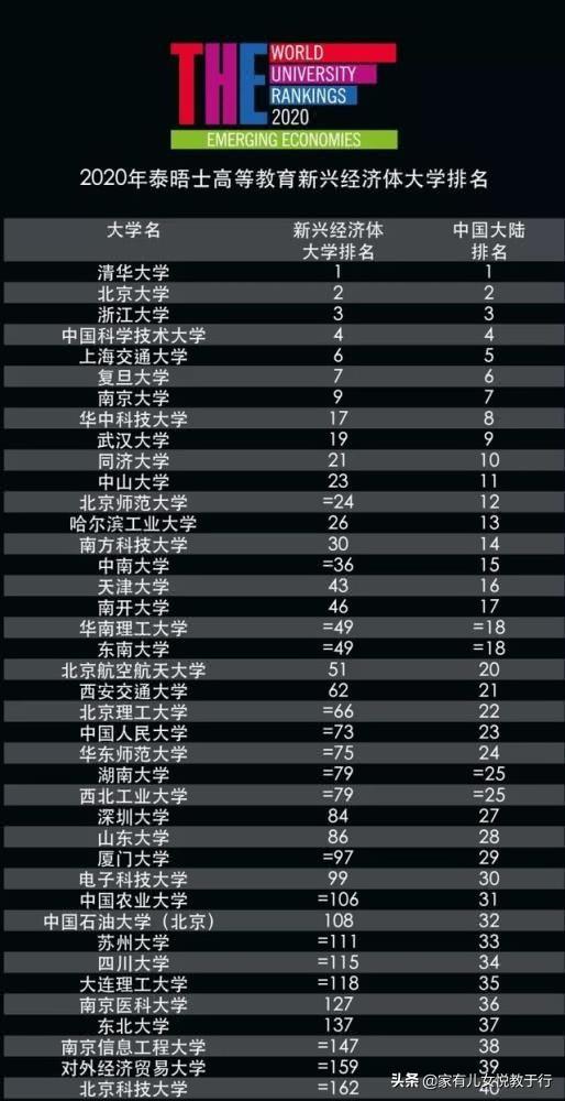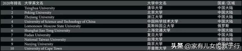 泰晤士高等教育2020年新兴经济体大学排名,其中位列中国内地前10名的大学有:清华大学、北京大学、浙江大学、中国科学技术大学、上海交通大学、复旦大学、南京大学、华中科技大学、武汉大学、同济大学、中山大学。