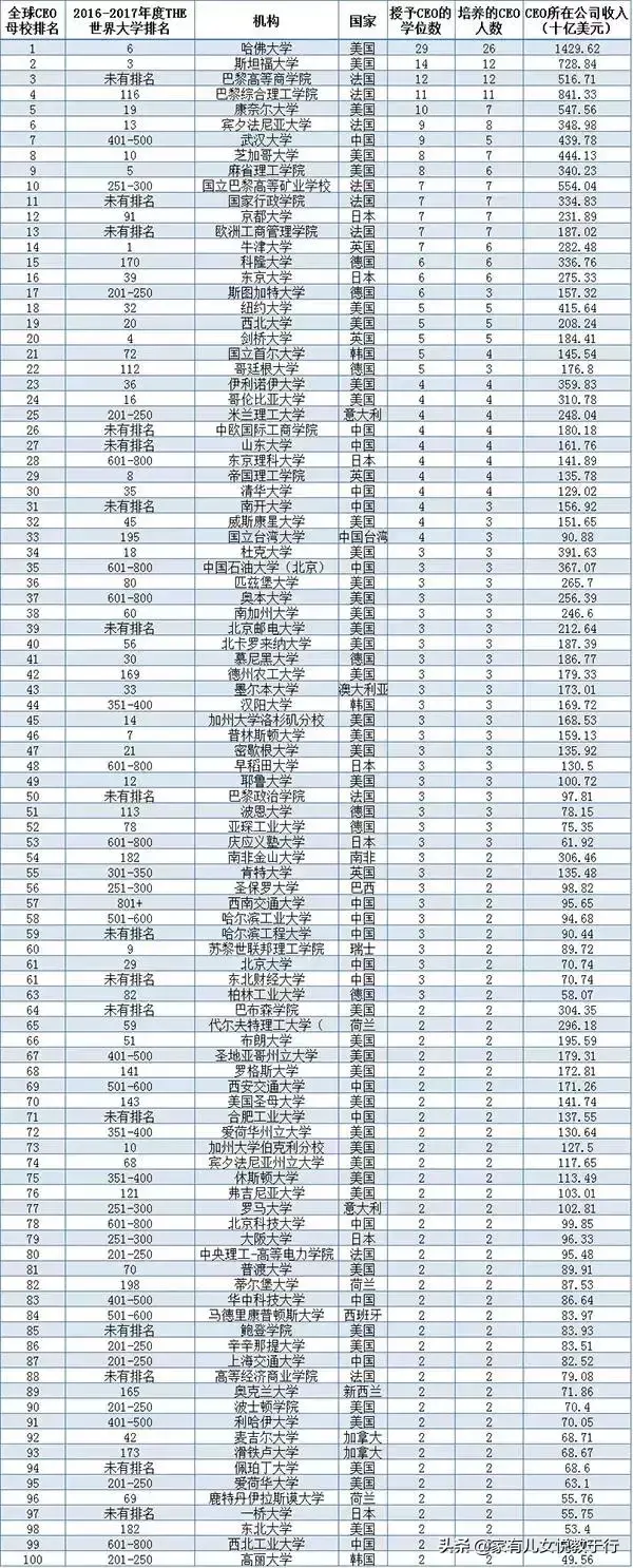 根据泰晤士高等教育最近一次,即二零一七年度全球CEO母校排名。该榜单是以大学授予世界五百强首席执行官的学位数量为评选依据,共收录全球一百所大学,榜单清晰地列出了这些顶级CEO的教育背景。