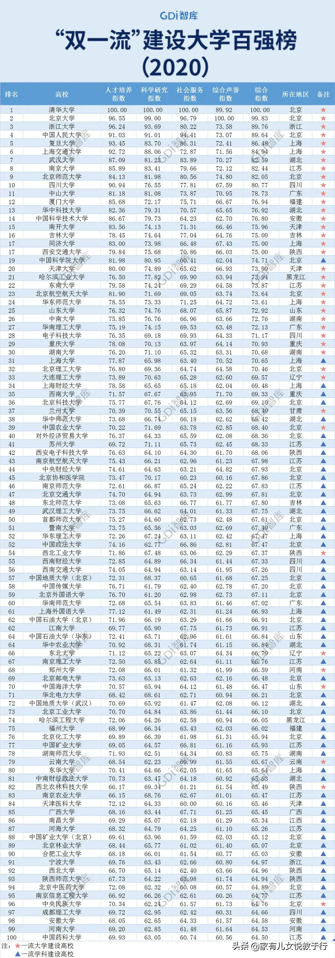 由广州日报数据和数字化研究院(GDI智库)发布“‘双一流’建设大学百强榜(2020)”(下称“‘双一流’大学榜”),以人才培养指数、科学研究指数、社会服务指数和综合声誉指数四个一级指标构建综合指数,对137所“双一流”建设高校(不含军事院校,中国地质大学、中国矿业大学和中国石油大学实行“一个校名、两地办学”,分别进行评价)进行评价,