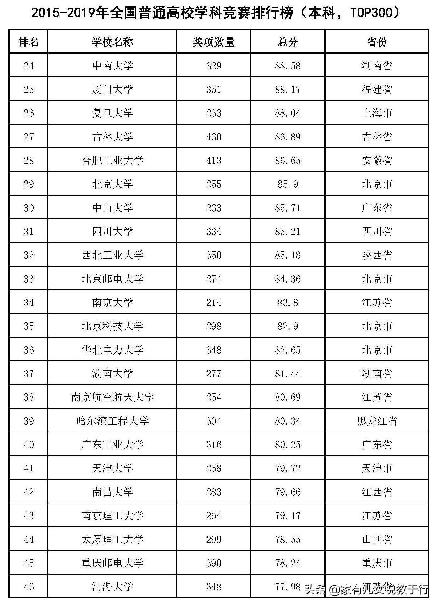 2020年2月22日,中国高等教育学会《高校竞赛评估与管理体系研究》专家工作组发布2015-2019年和2019年全国普通高校学科竞赛排行结果。学科竞赛水平体现出学校的学术和教育实力,其中排名靠前的高校如下。