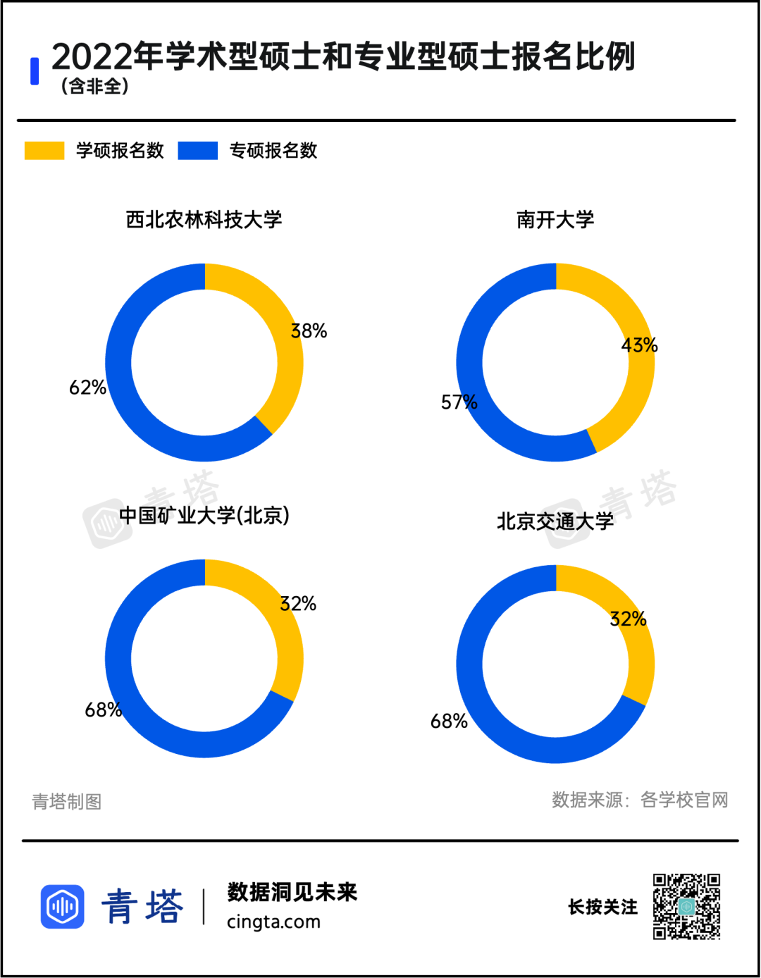 在2022考研报名中,南开大学、西北农林科技大学、中国矿业大学(北京)、北京交通大学等“双一流”高校的专硕报名比例均超过学硕。