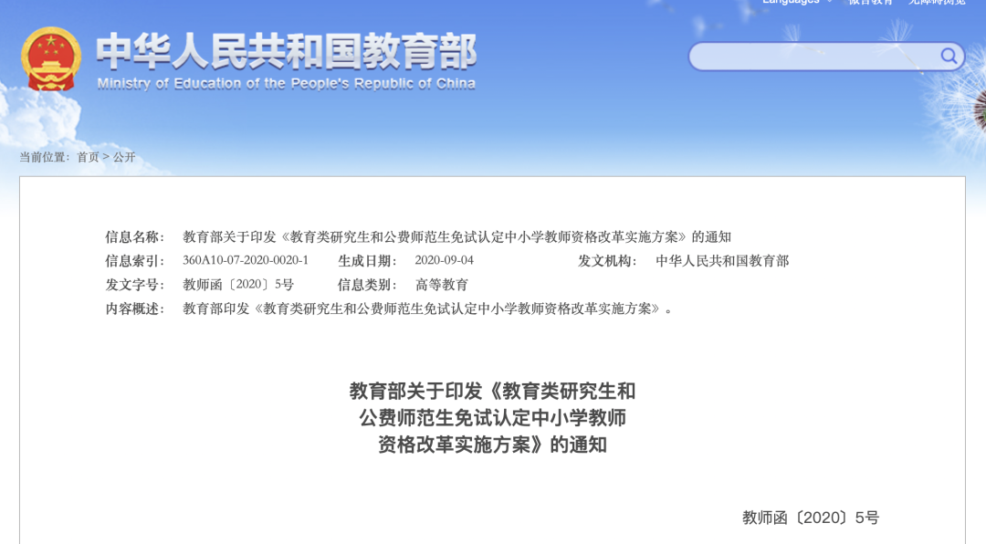 以教育类研究生为例,教育部已经印发了《教育类研究生和公费师范生免试认定中小学教师资格改革实施方案》。