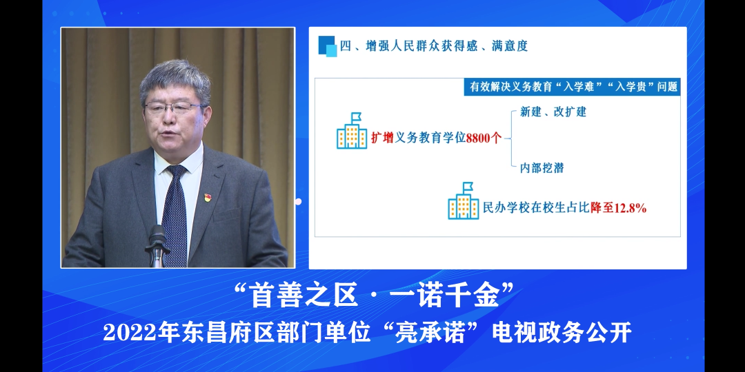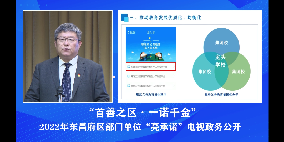 在东昌府区政府面向全社会开展的“首善之区·一诺千金”活动中,东昌府区教体局党组书记、局长刘建吾承诺:分别以文轩中学、东昌中学、聊城市实验中学为龙头,组建优质集团校,进一步扩充优质教育资源,推动高中优质特色发展,让更多的学生升入理想的学校。