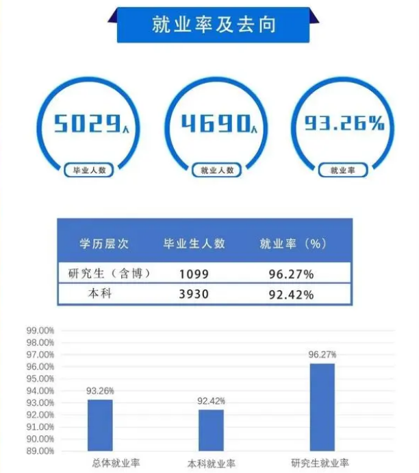 据学校发布的2020年就业质量报告显示:上海海事大学2020届毕业生共计5029人,就业率93.26%,其中本科生就业率92.42%,研究生就业率96.27%