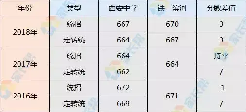 2018年,铁一滨河的统招线为670分,定转统分数线为667;西安中学统招线667分,定转统分数线664分(统招)。