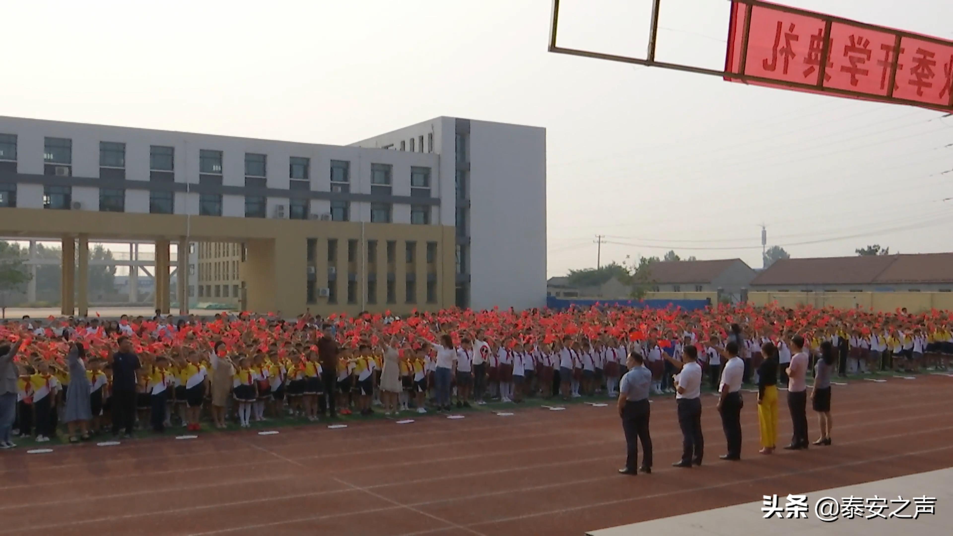 【解说】与以往不同,今年泰安市第一实验学校小井分校学校给每名师生都发放一面国旗,伴随着《五星红旗》的歌声,大家挥动国旗,一场庄严的爱国主义教育在操场上进行。