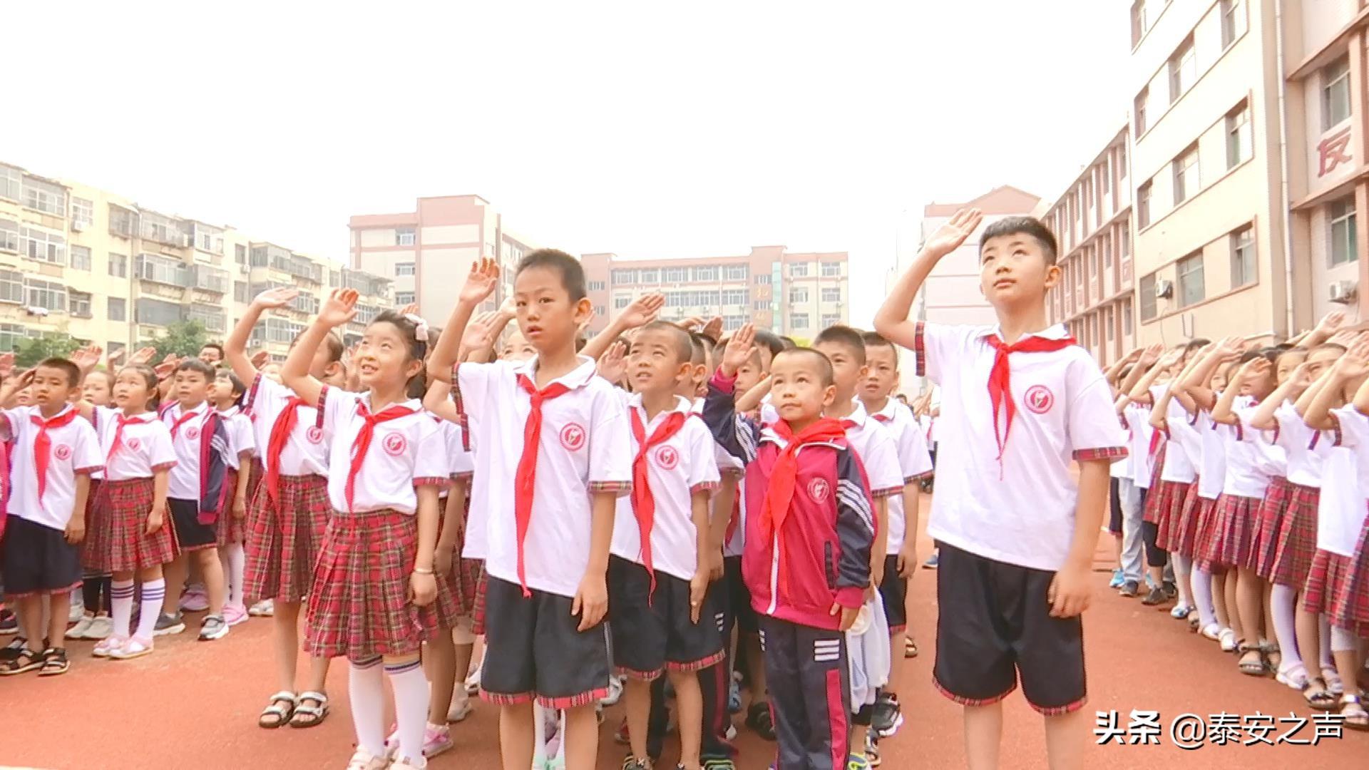 【解说】新生报到第一天,《我和我的祖国》就唱响新泰。新泰市第一实验小学、第四实验小学、青云中学等学校的教师带领学生致敬祖国母亲。