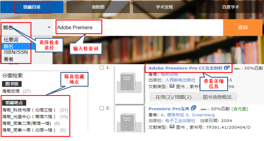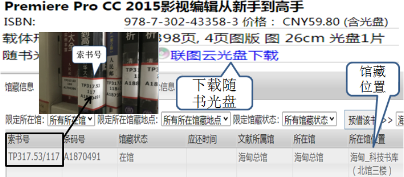 选择图书馆主页上检索框的“馆藏目录”,输入检索词即可检索图书馆馆藏书刊(亦可使用微信或移动图书馆检索),点击检出文献题名可查看图书详细信息。读者可记下图书的馆藏地点和索书号,到相应书库按号索书。