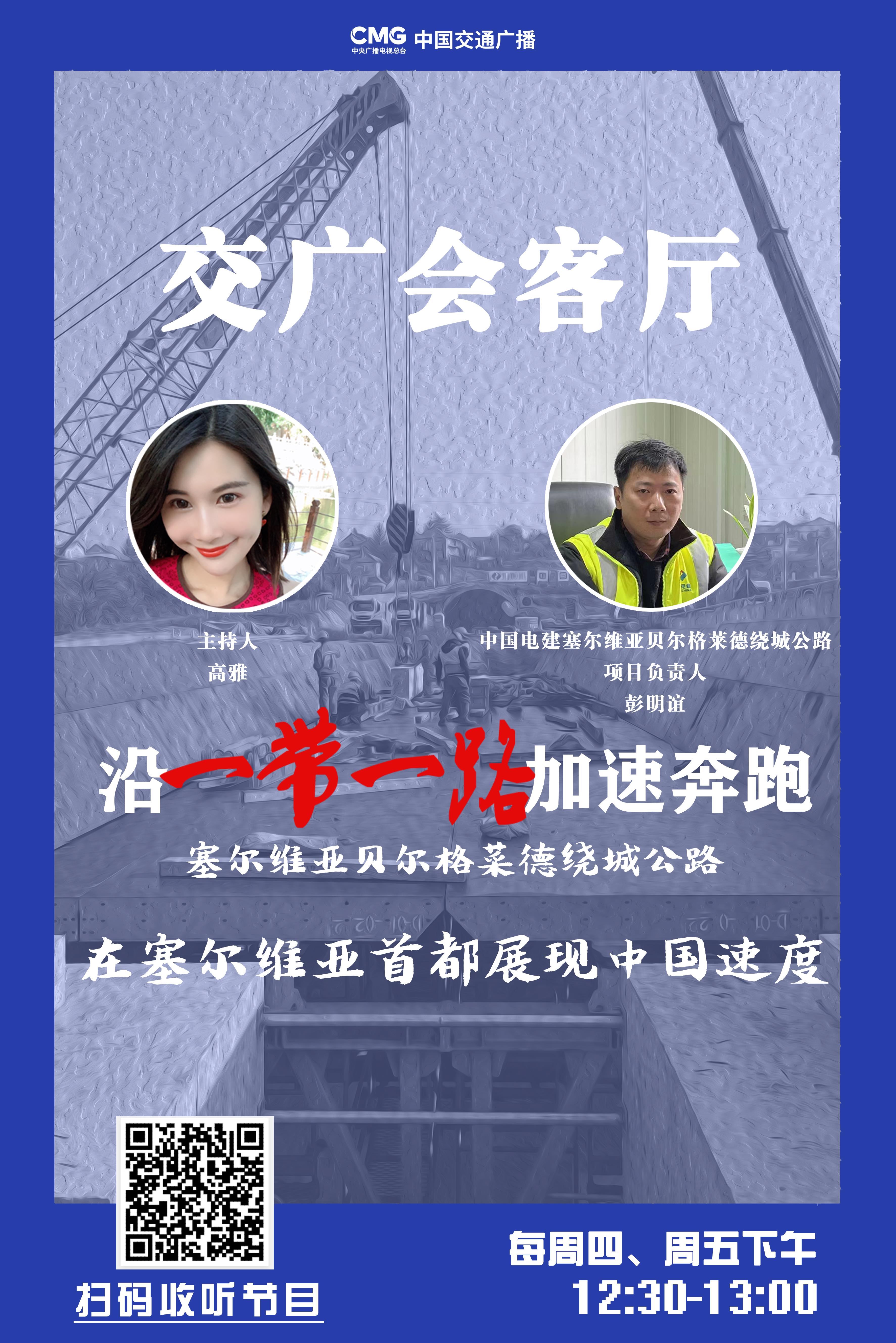 风从东方来,丝路花正开。自“一带一路”倡议提出8年多来,已经成为当今世界深受欢迎的国际公共产品和国际合作平台。中央广播电视总台中国交通广播《交广会客厅》特别策划—沿“一带一路”加速奔跑,让我们共同感受,中国交通人为“一带一路”建设奉献的强大助力。本期节目带领大家来到被称作欧洲十字路口的国家塞尔维亚。地处欧洲交通枢纽,这里的交通繁忙程度究竟如何?中国又是如何在这里开展交通建设的?让我们就一起走进由中国承建的塞尔维亚贝尔格莱德绕城公路,听中国电建项目负责人彭明谊为我们讲述那里的故事。