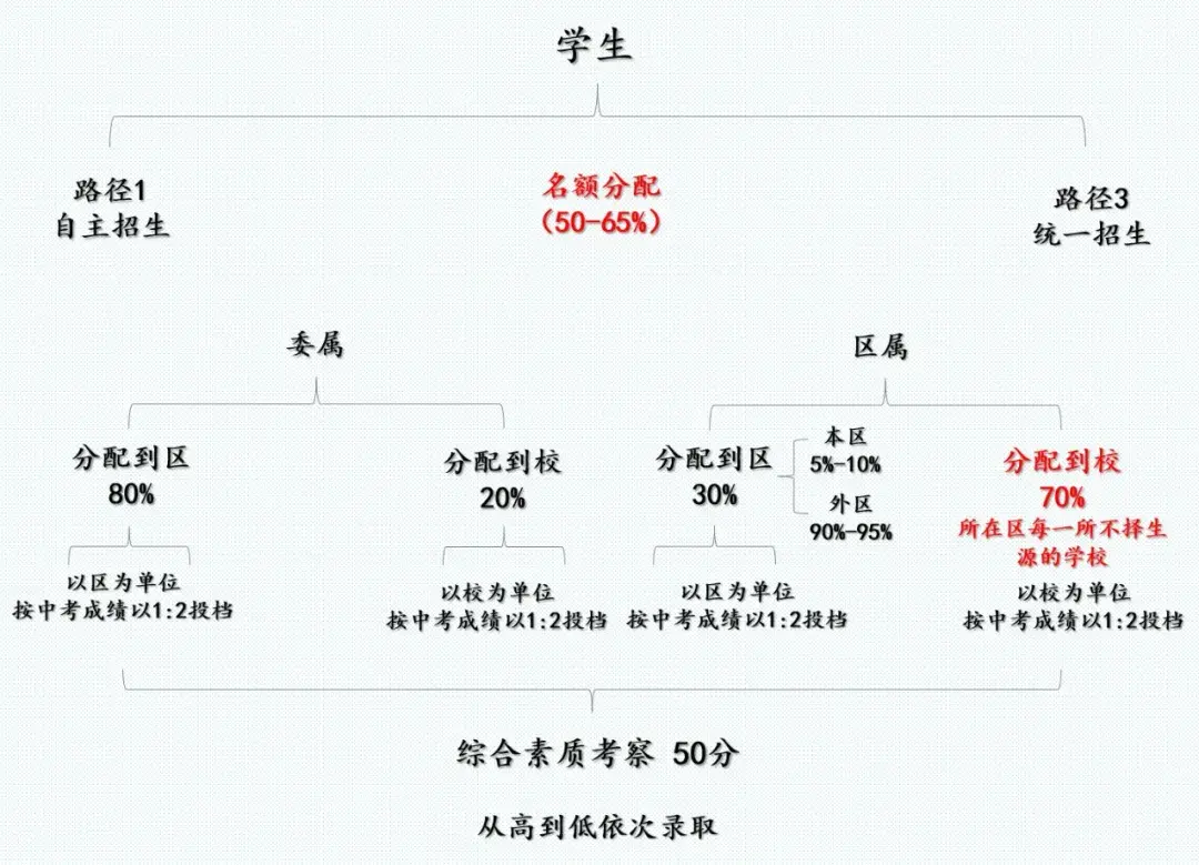 名额分配,占比招生计划中50-65%,而这其中30%分配到区,70%分配到校
