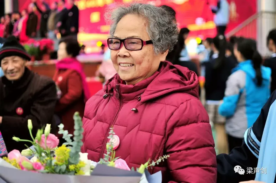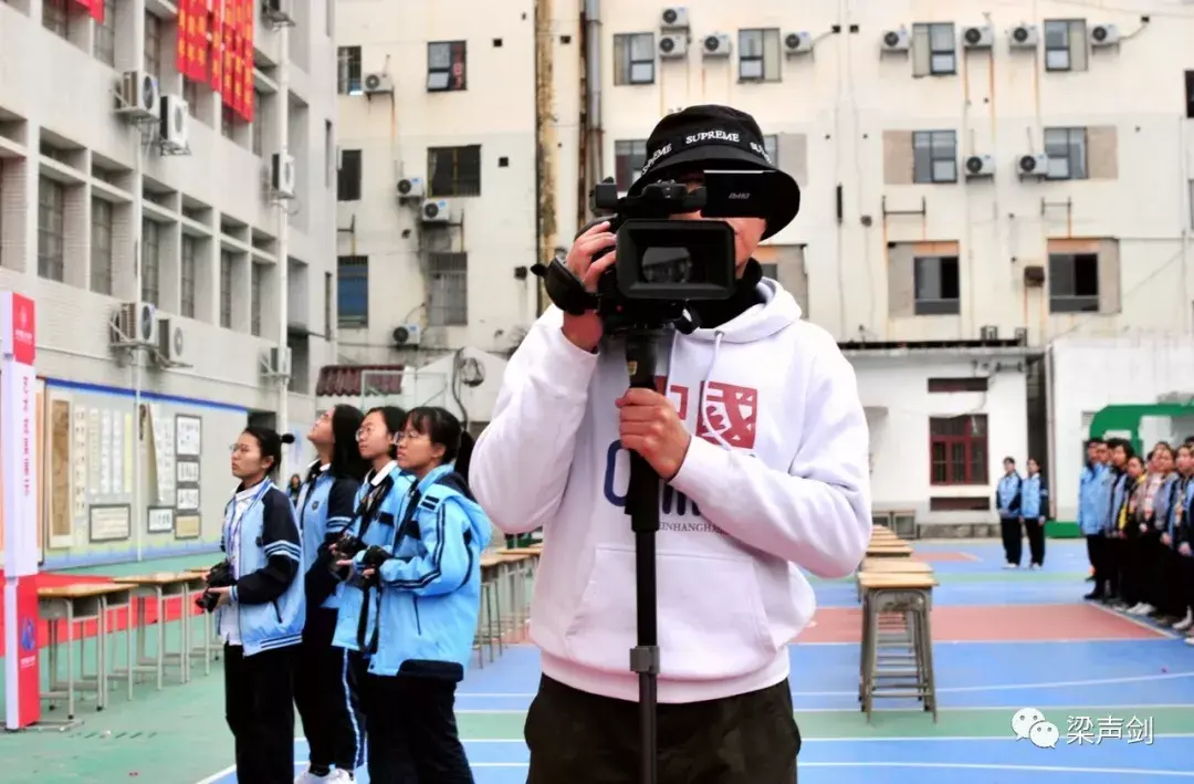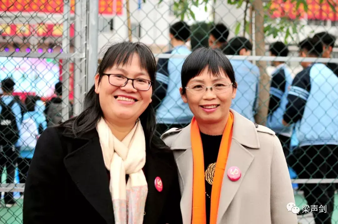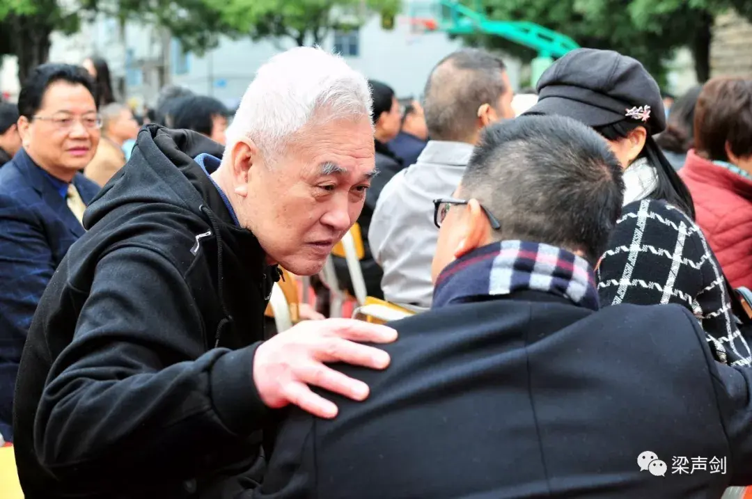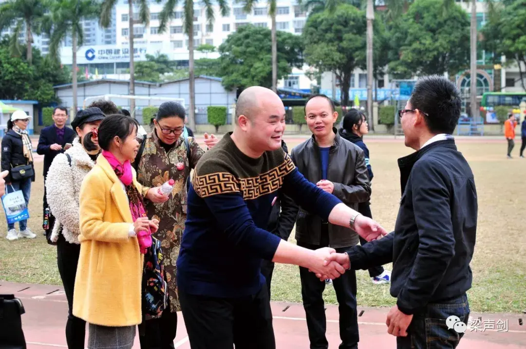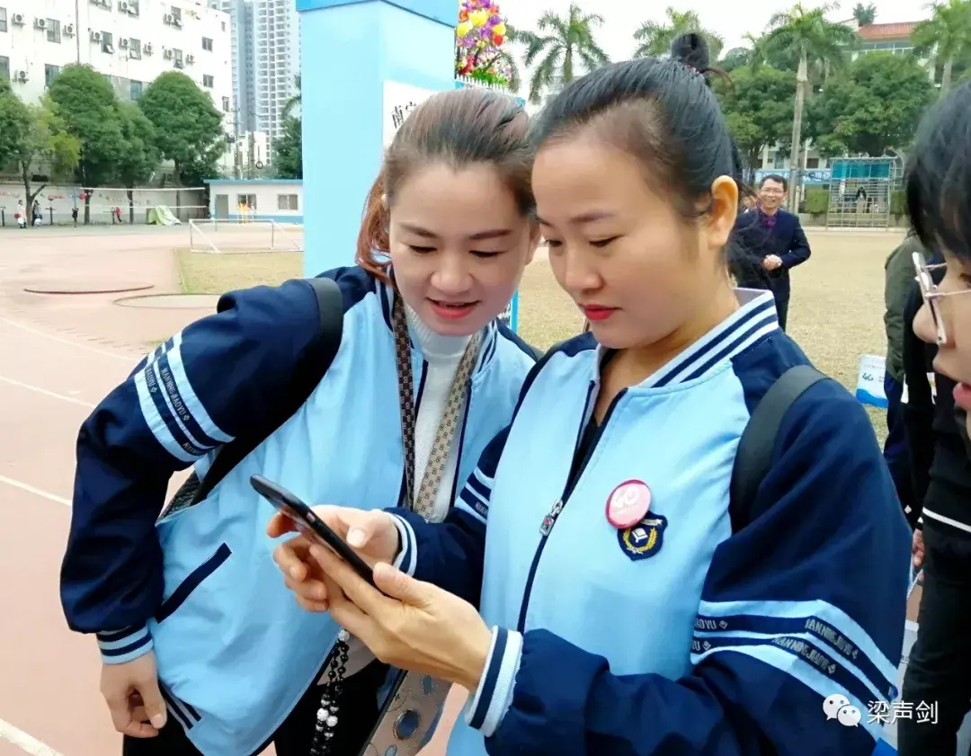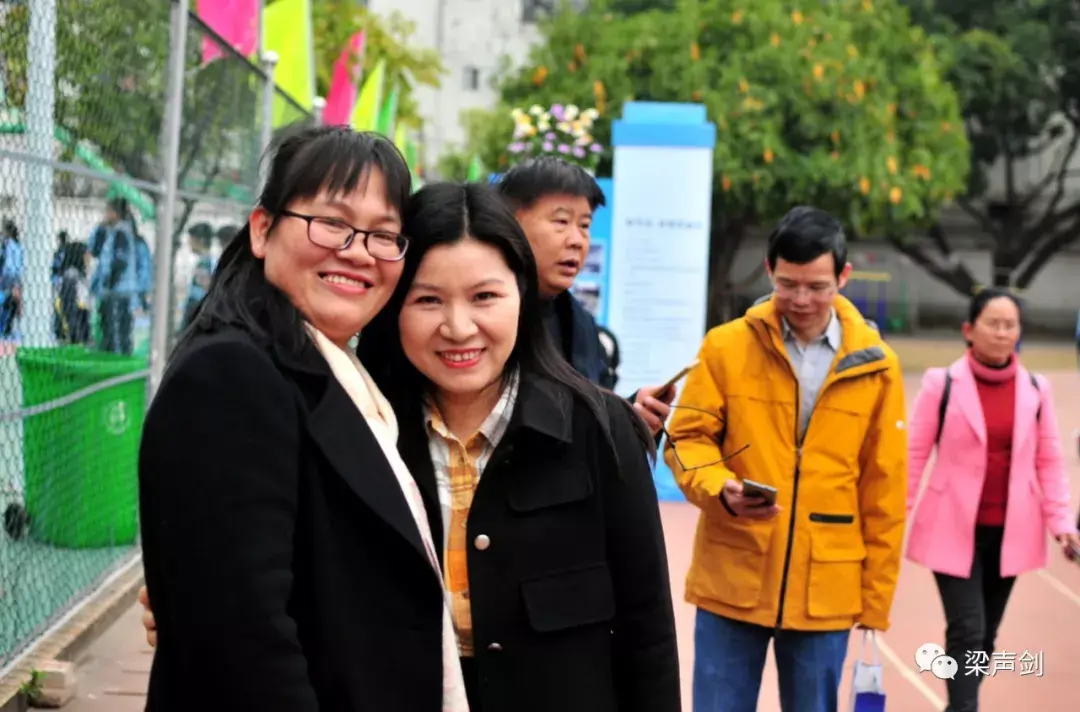 我是抱着回校赶考的心态回来了,一进校门便游弋于这个熟悉的校园内,行走于操场庆典大会的各个角落,用一部单反相机一个35mm定焦大光圈镜头和一部华为手机全方位多角度的拍摄,远景中景近景特写,人事物俱有。我在舞台右侧和摄影组的同学一起拍摄时,还指点与鼓励他们大胆勇敢地拉长焦镜头对准校领导多拍摄特写。我适时等候梁惠萍老师和周文工老师,他们在舞台上领奖和走下台阶时抓拍了一些照片,也摆拍了几张他们捧着鲜花的现场照片。语文老师周文工发现我时和我心有灵犀地拥抱了一下,其实我们有二十年没见面了,留意到这一幕被旁边的摄影师同学拍了下来,不知什么时候能看到这张照片。然后,我又到舞台正中间的老师席位区找到高中班主任谢寄平老师,和他握手,他说退休十几年了,头发全白了还记得我是哪届的,特别提到同班同学副班长林小良在母校教书二十几年了,挺厉害的。我以舞台为背景为他拍照留念。