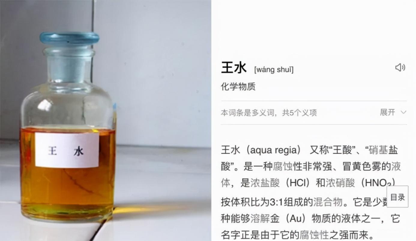 王水由浓硝酸和浓盐酸1:3的比例混合制成,酸性和氧化性极强,是少数能够溶解金和铂的溶液。