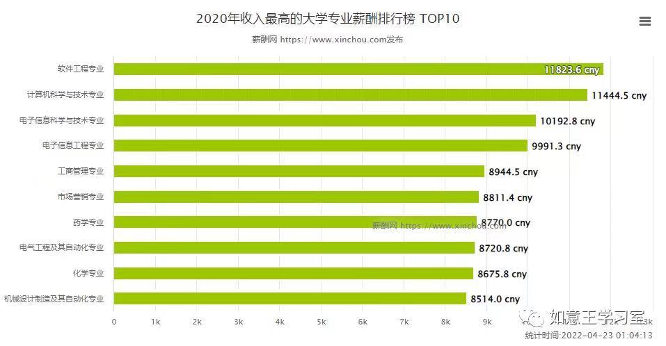 下图是中国薪酬网统计的2020年收入最高的10个大学专业: