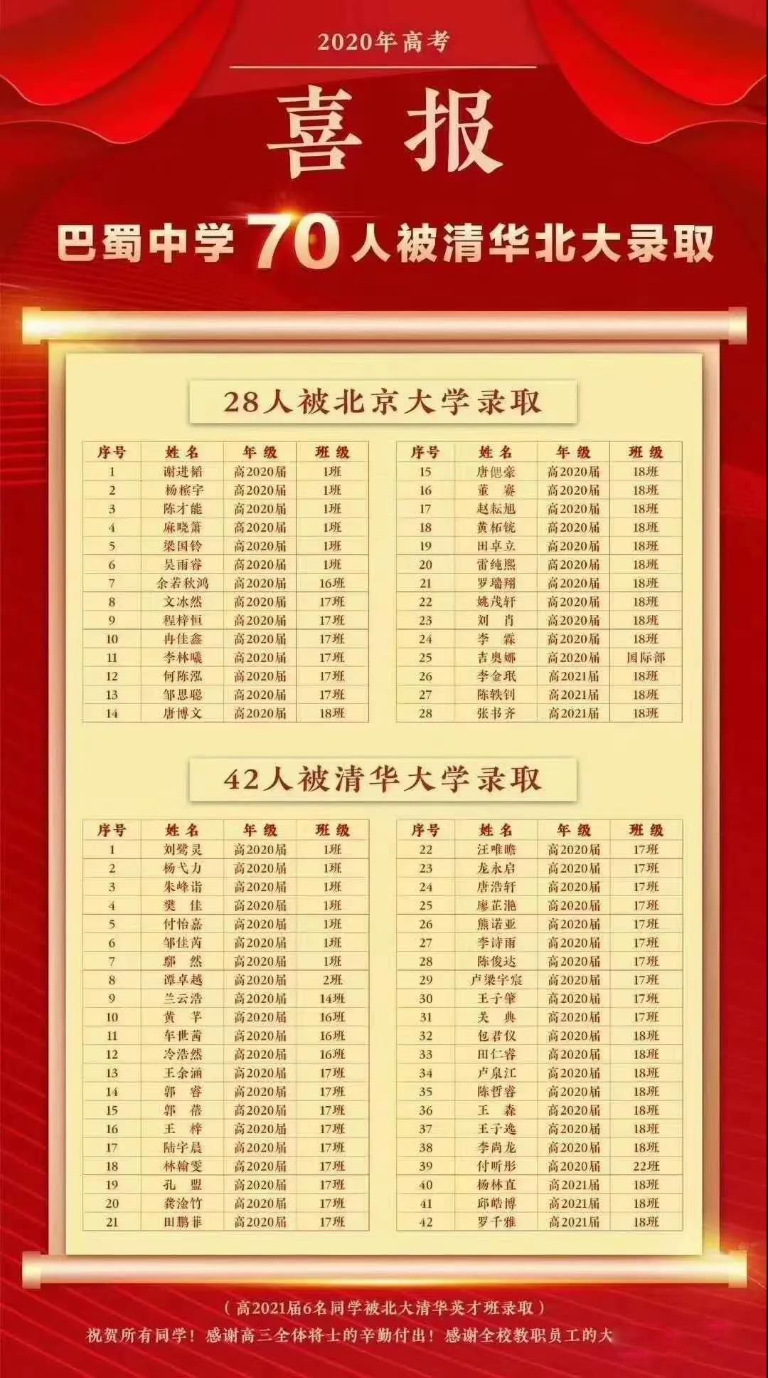 据悉,2020年重庆巴蜀中学共有70名学子北清华、北大录取。