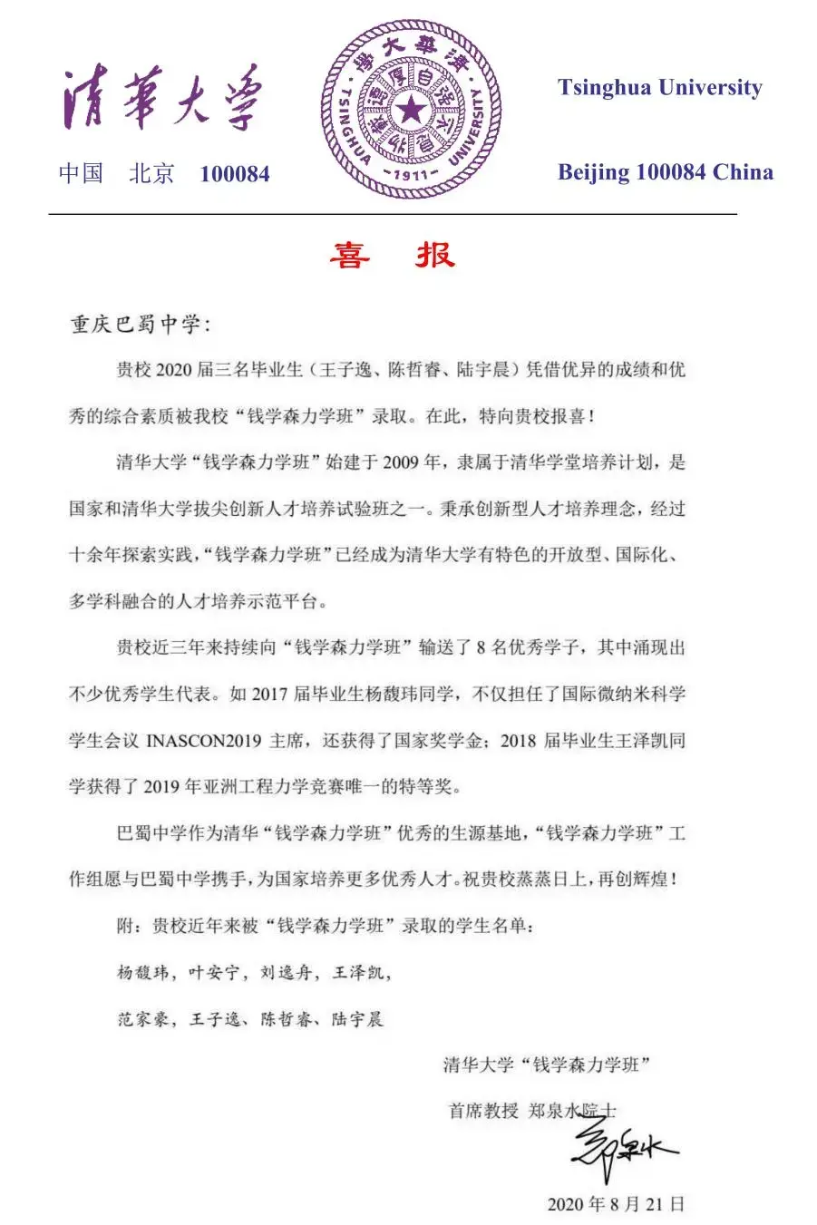 同时,其中3名巴蜀学子被清华大学“钱学森班”录取,2020年录取人数全国第一!