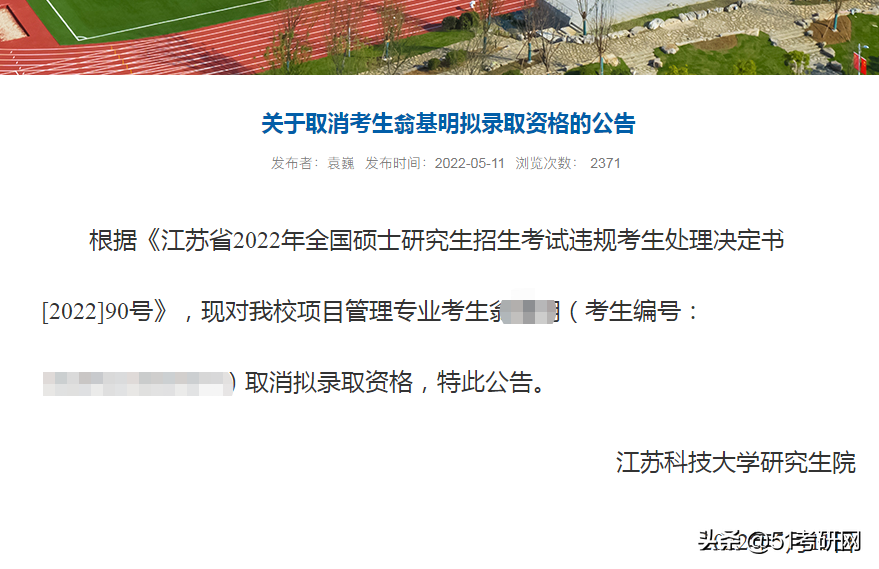 5月11日,江苏科技大学研究生院官网发布公告:根据《江苏省2022年全国硕士研究生招生考试违规考生处理决定书,撤销项目管理专业一考生的拟录取资格,但具体的违规原因尚未公布。