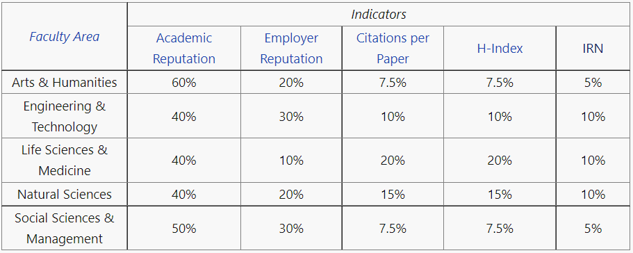 不同学科领域排名所使用的不同权重,图源QS官网