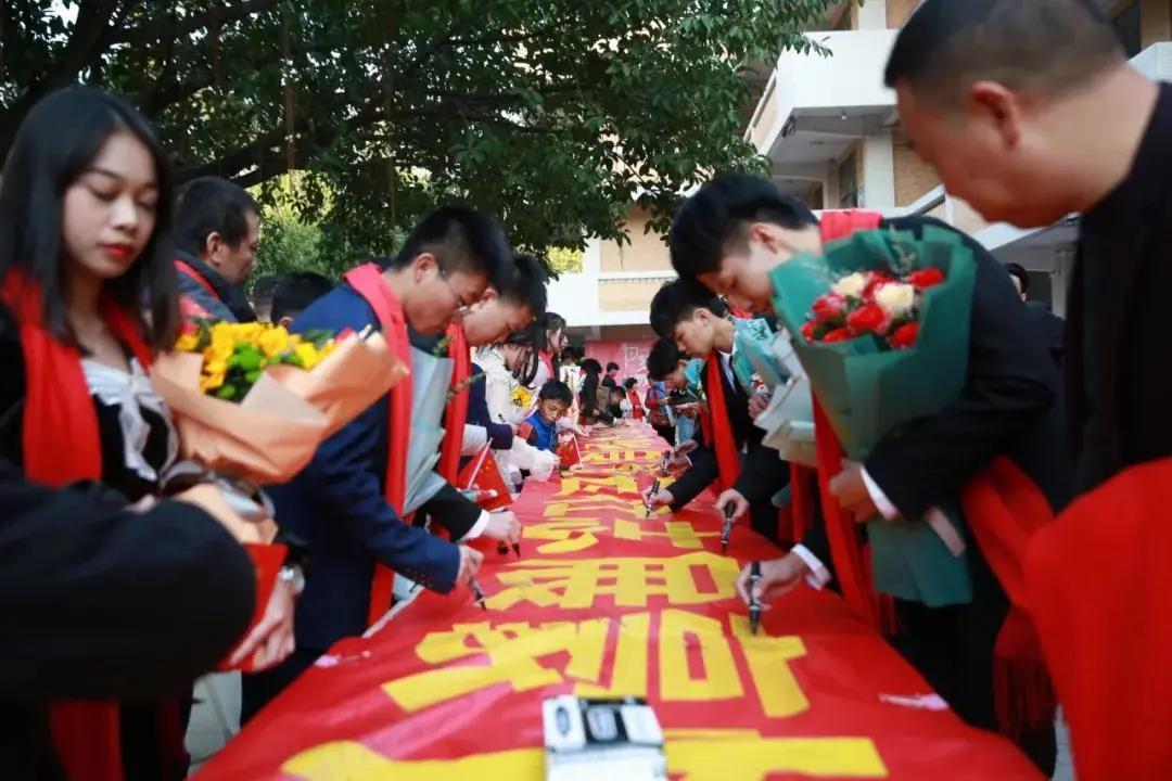 走过“成人门”。走上两边布置着各班“家长寄语”与大合照的“成功大道”,走到高三教学楼前,在横幅上写下未来梦。写下青春的愿望,留下青春的笑容。