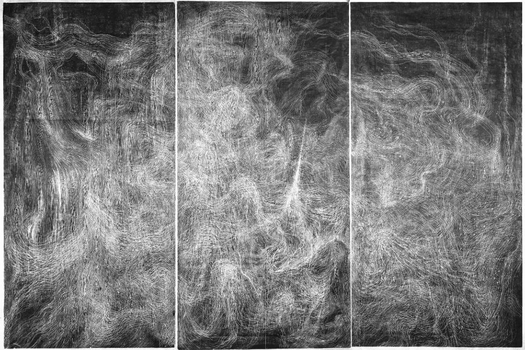 就像雨瞳,大部分作品是木刻,我觉得做得也很好。她那种巨大的线条缠绕的作品,那里面就能反映出她一个东北大妞身上狂野的东西,她就是那样子的,做得特别的自我。我从来没要求过她跟我学水印,我跟她说现在做的那些木刻很好,要抓紧做,把这个东西变成自己的图式,要占山头,争地盘,因为在艺术创作里能找到一点突破已经很不容易了。