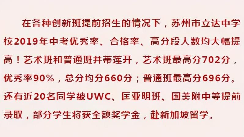 艺术班最高分702分,优秀率90%,总分均分660;普通班最高分696分,还有近20名同学被UWC、匡亚明班、国美附中等提前录取。