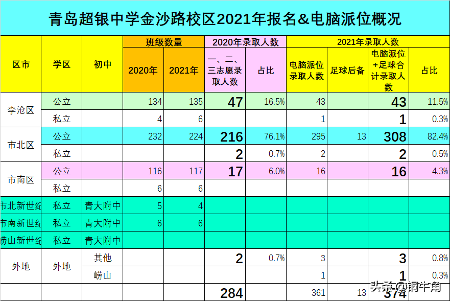 青岛超银中学金沙路校区2021年直升人数为10人,足球后备力量13人,通过电脑派位招收的361名学生。直升生源中,4人为超银小学直升,5人为教工子女,1人为职工子女。教职工的生源分布,铜牛角无法搞清楚,电脑派位的生源分布大致如下: