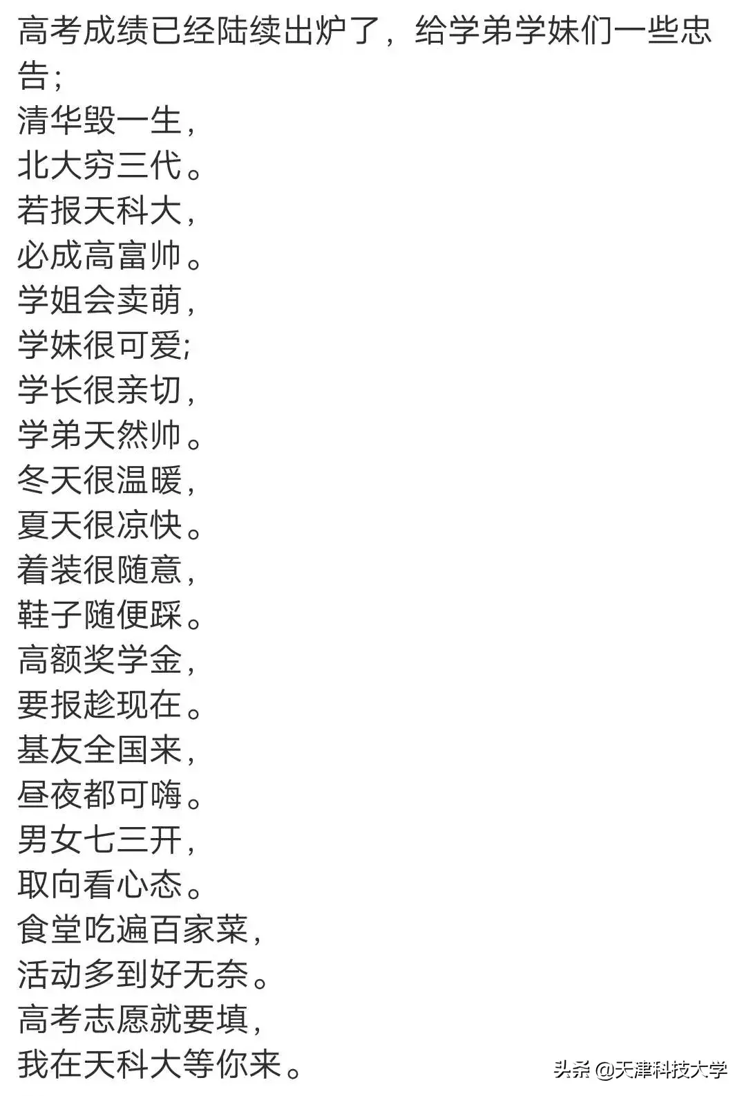 版权声明:我们致力于保护作者版权,注重分享,被刊用文章【天津科技大学官网(高考成绩新鲜出炉)】因无法核实真实出处,未能及时与作者取得联系,或有版权异议的,请联系管理员,我们会立即处理! 部分文章是来自自研大数据AI进行生成,内容摘自(百度百科,百度知道,头条百科,中国民法典,刑法,牛津词典,新华词典,汉语词典,国家院校,科普平台)等数据,内容仅供学习参考,不准确地方联系删除处理!;
