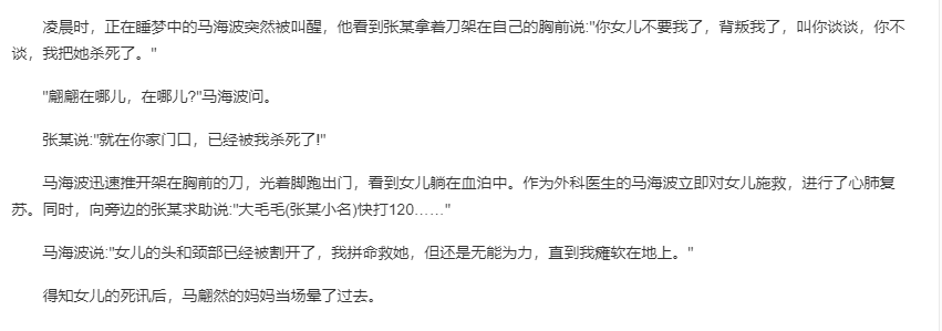 张永磊并没有逃走,他走进马翩然的家中,叫醒了熟睡的马翩然父母,并且把刀架在马翩然父亲胸前,